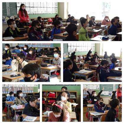 1組は外国語活動です。町でよく見かける看板の文字のアルファベットを使って学習しています。