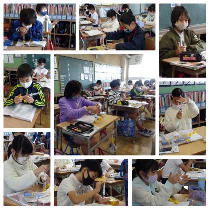 2組は理科、空気のパワーを注射器型の教具を使って体感しています。