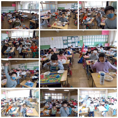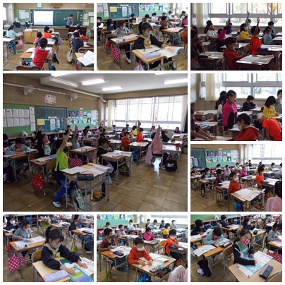 1組は給食の様子です。みんな静かに食べています。写真の時だけ、ピースしてくれました。2組は算数です。かけられる数とかける数、わかったかな?
