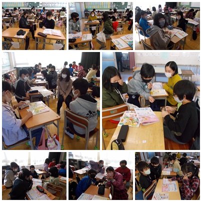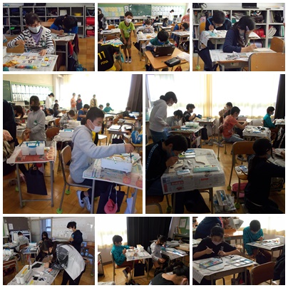 1組は図工です。素敵な作品ができあがりつつあります。2組は家庭科です。献立を選んだ理由について話し合っています。