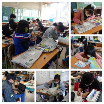 1組は書写、年賀状のイラストをかいています。
