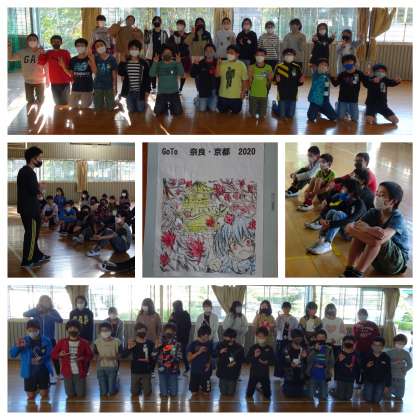 体育館で写真隊形の練習をしました。このあと、修学旅行クイズです。何問正解できたかな。