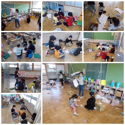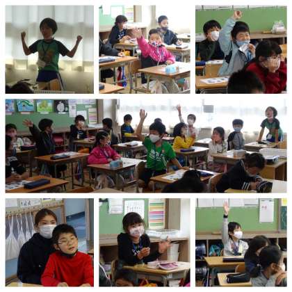 1組は生活科のおもちゃ祭りの準備をしていました。楽しんでもらえるようにいろいろな工夫をしていましたね。2組は英語の授業の様子です。ALTのマービック先生のお話を聞きながら楽しく学習していました。