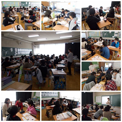 1組は、書道作品「ちょうちん」の文字や絵をかいていました。みんな集中していましたね。2組は英語の授業です。グループで何を食べたのか英語で話していました。