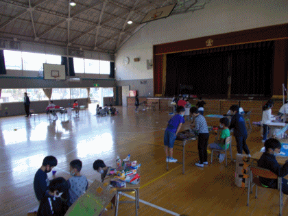 1年生を迎えて体育館でおもちゃまつりをしました。2年生は、1年生に楽しんでもらうために、みんなで協力して一生懸命おもちゃをつくりました。本番では、1年生が楽しんでいる様子が見られ、とてもよかったです。感想でも「楽しかった」という1年生が何人かいました。この経験をこれからの学習に活かしていきます。