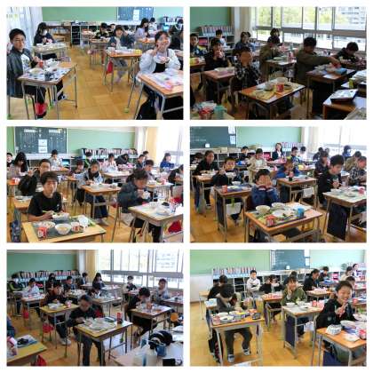 今日の給食はお赤飯。入学と進級のお祝いです。