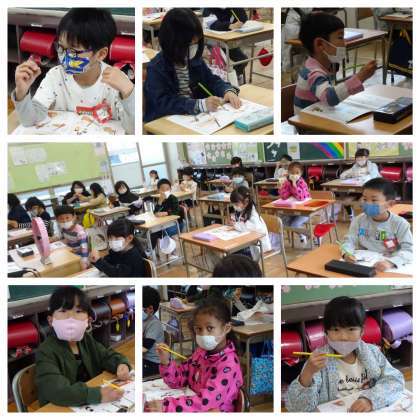 1組は、鉛筆のもちかたの練習です。2組は、先生が読んだお話を聞いて、質問に答えています。