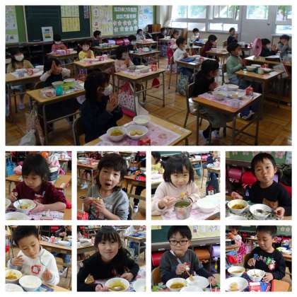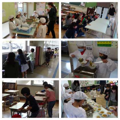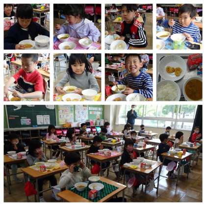 手を洗って机の上を消毒、当番は着替えて配膳、静かに待って自分の給食を取りに行く、という流れを覚えました。今日はカレーです♪