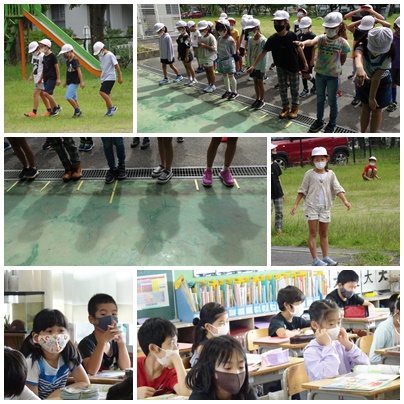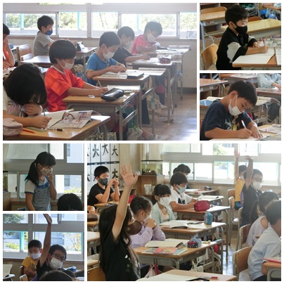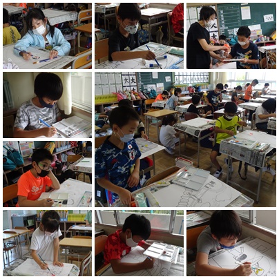 1組は図工、色塗りを始めました。2組は理科、かげの勉強です。