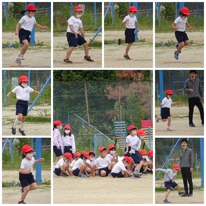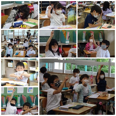 1組は体育「けんけんぱ」です。2組は漢字の練習、目をつぶって書ける子もいましたよ。