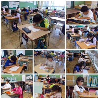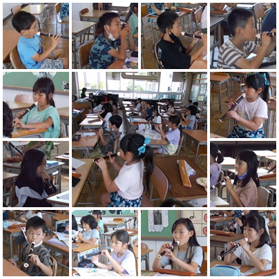 1組は、音楽の授業の様子です。リコーダーで“ラ”の音が上手に吹けるようになりました。 2組は、漢字のテストの様子です。結果が楽しみですね。
