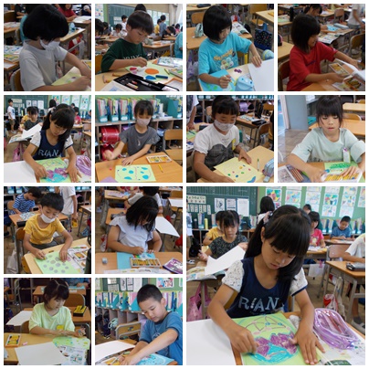 図画工作の授業の様子です。今日は「ふしぎな たまご」から生まれるものやお話を想像して絵に表しました。カラフルな作品がいっぱいです。
