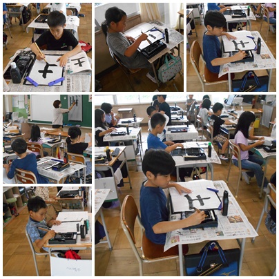 書の時間の授業の様子です。書道講師に教えていただき「土」を書きました。