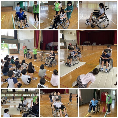 福祉実践教室の授業で、車いすの体験をしました。車いすで移動することの大変さや、サポートする側の存在が大切なことなどを実感していました。今後、車いすなどで困っている人を見かけたら、お手伝いができるといいですね。
