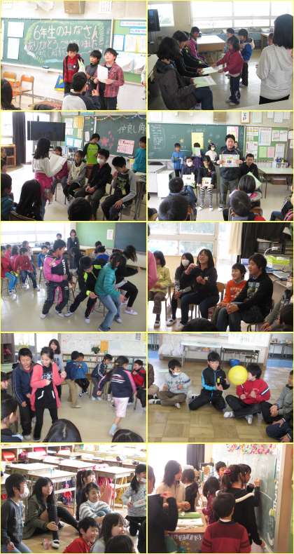 2月27日(水)、仲良し班解散式を行いました。みんなで作った色紙を6年生にプレゼントし、6年生といっしょにゲームを楽しみました。運営の5年生は、次のリーダーとしての自覚を持って一生懸命頑張っていました。