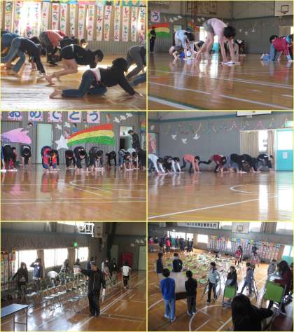 3月14日(木)、体育館のからぶきをし、卒業式の練習のためのいすやひな壇などの準備をしました。