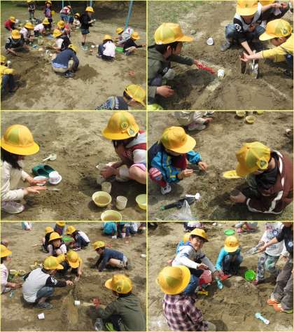 4月23日(火)、みんなで砂遊びをしました。友達と仲良く山やトンネルなどを作って遊ぶことができました。とっても楽しかったです。