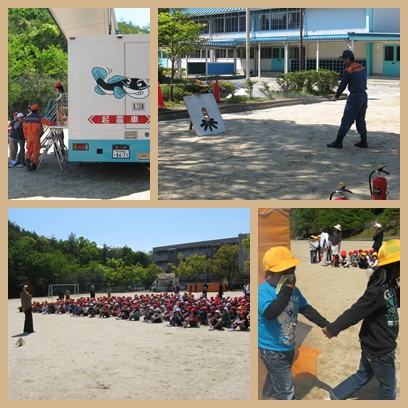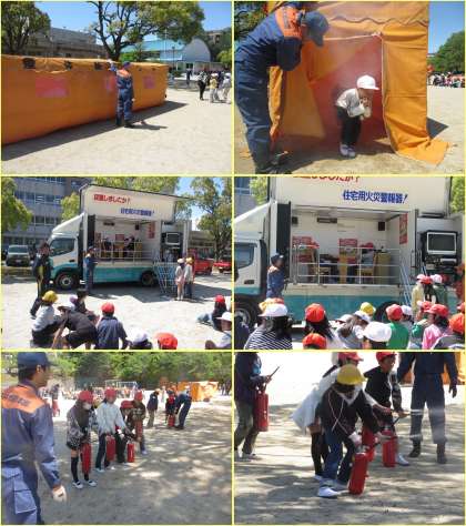 5月1日(水)、「理科室より火災が発生し延焼の恐れあり」という想定で避難訓練を行いました。各教室からの避難経路と避難時の注意事項を学習することができました。避難訓練の後、2年生は煙道体験、4年生はグラッキーによる地震体験、6年生は消火器による消火訓練を行いました。