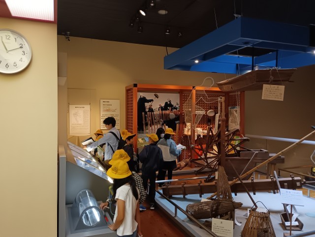輪中の里で輪中の生活について話を聞いたり、資料館でここにしかない資料を見学しています。