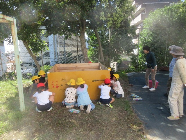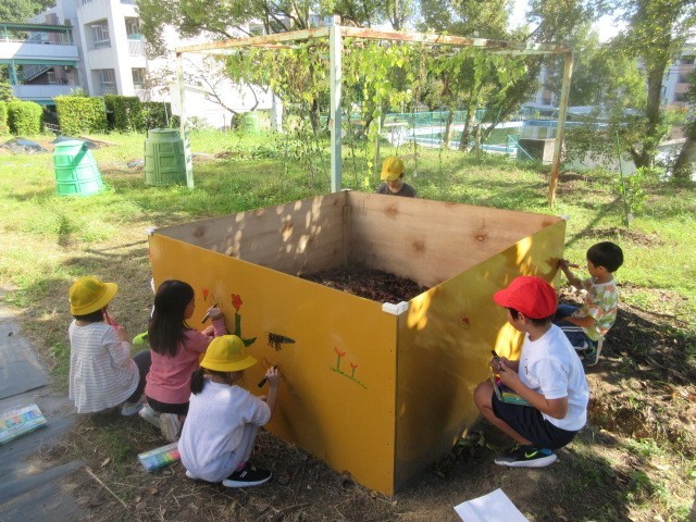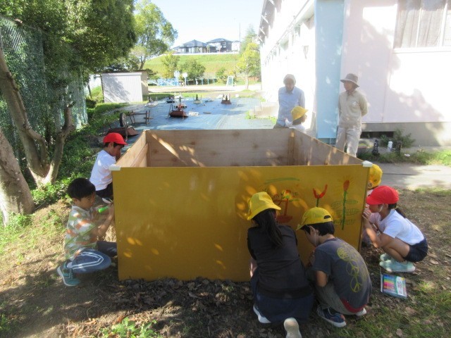 1023 落ち葉コンポストイラスト描き 1・2年生 公開日 2025/10/23 更新日 2025/10/23 学校の様子 1・2年生の児童の皆さんに、落ち葉コンポストへイラストを描いてもらいました。どの子も前もって描きたいものを考えたり、準備したりしてくれて、好きな動物や昆虫、花などを一生懸命に描いてくれました。PTA会長さんも応援に駆けつけてくれました。昨日雨のため延期した3・4年生の皆さんは、来週29日に行います。楽しみにしていてくださいね。 +2