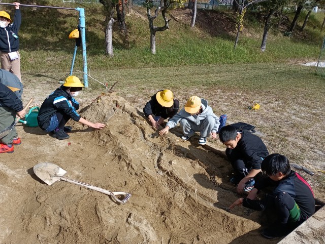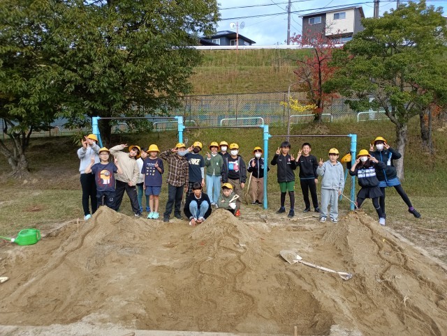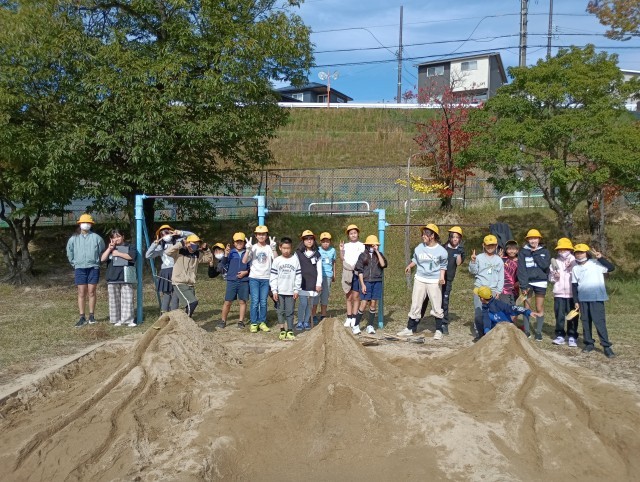 流れる水のはたらき調べるため、砂場で川を作り観察しました。