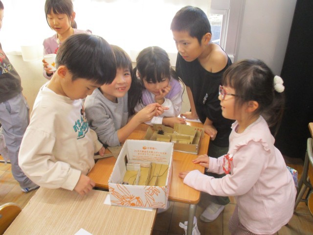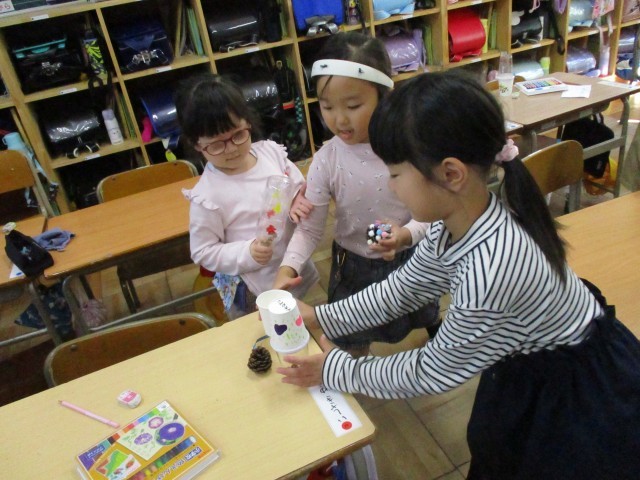 先日、高森山で拾ってきたどんぐりやまつぼっくりを使って、おもちゃ作りをしました。
