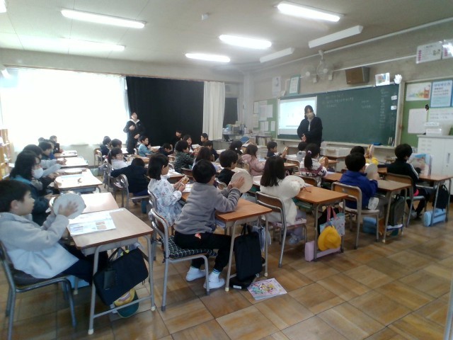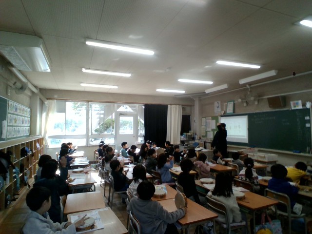 1年生は、カスタネットとタンバリンを使ってリズム打ちをしていました。
