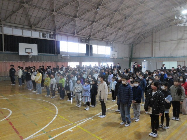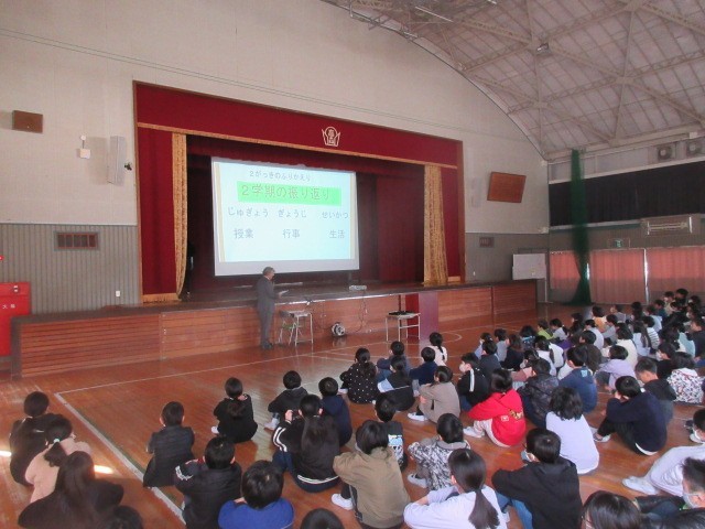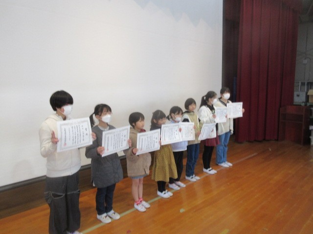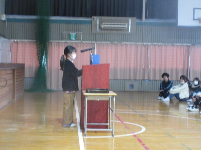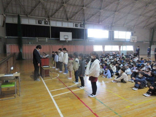 式の前に、10月に行われた席上揮毫大会に学校代表として出場して入賞した児童の表彰を行いました。次に、2学期にがんばったことの作文発表を2年生の代表児童の人が行いました。大きな声で自信をもって発表することができ、自分の目標に向かって努力して大きく成長できたことを感じました。また校長先生からは、2学期の生活と学習、行事を振り返って、高森っ子たちのこれまでのがんばりを褒めていただきました。