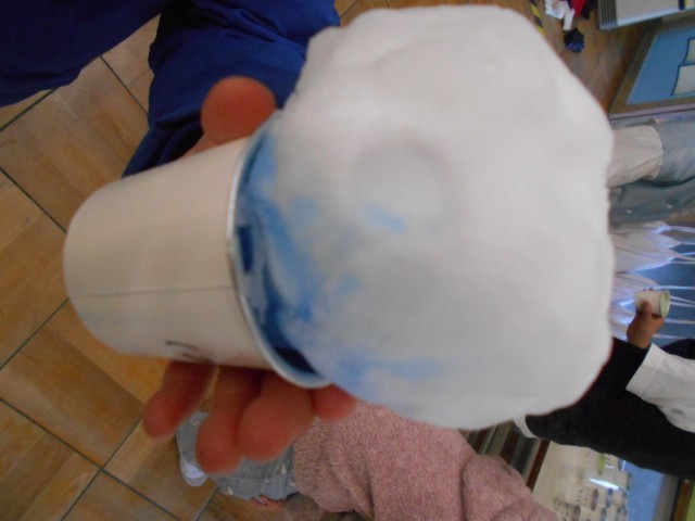 今日は冷え込みが強く、外に置いたカップの中の色水が凍りました。とてもきれいな氷ができました。なかには、氷の上に昨日からの雪を氷にトッピングしている子もいました。