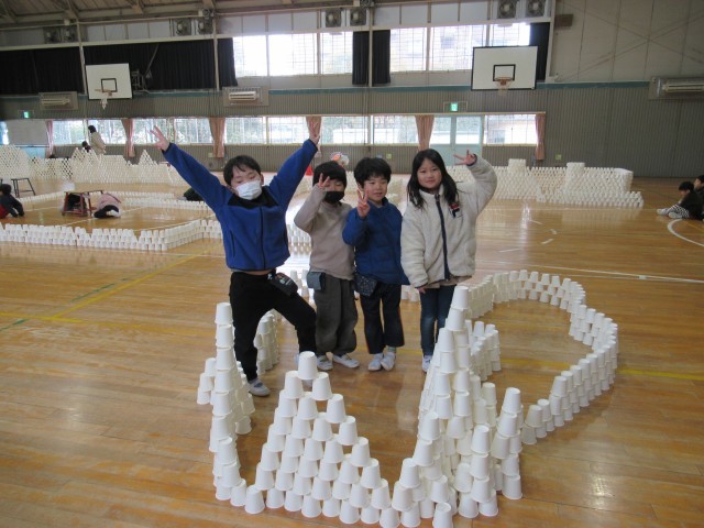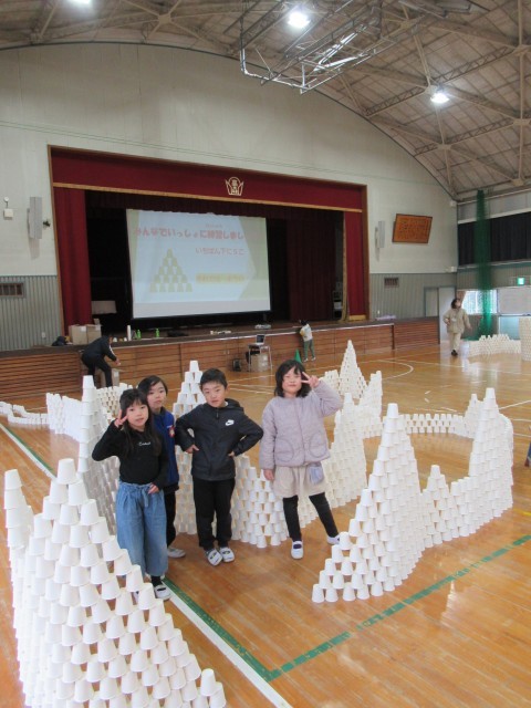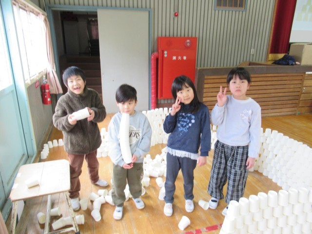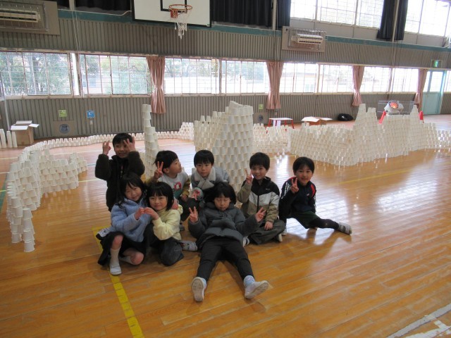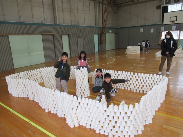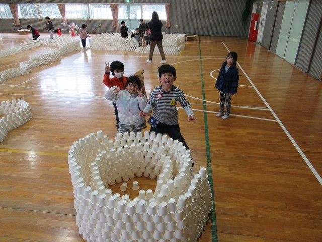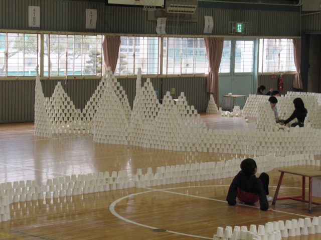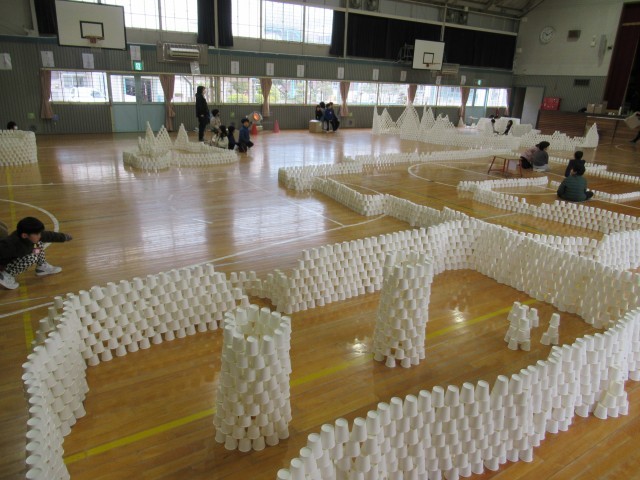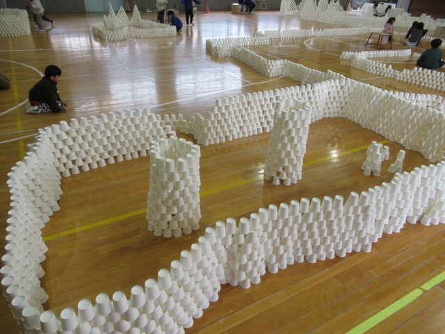 班ごとに1000個以上の紙コップを組み立て、協力して高いタワーや大きなお部屋を作って楽しみました。