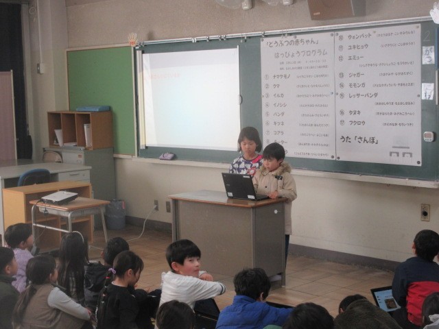 0212 3学期授業参観 1・2年生 公開日 2026/02/12 更新日 2026/02/12 学校の様子 1年生は、「動物のあかちゃん」について、グループごとに調べたことをスライドにまとめて発表しました。また、最後に元気な声で「さんぽ」の合唱をしました。2年生は、体育館で発表しました。縄跳びや跳び箱の発表や音読、九九など、1年間がんばってきた学習のまとめとして、いろいろな種類の発表をしました。 +1
