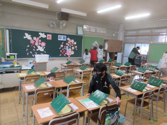 明日の卒業式に向けて、5年生が準備をしてくれました。式が行われる体育館をきれいに掃除したり、椅子を並べたり、6年生と56組の教室を華やかに飾り付けたりしました。6年生への感謝の気持ちを込めて、どの子もてきぱきと仕事をこなしていました。その姿がとても頼もしかったです。5年生が気持ちを込めて準備をしてくれたおかげで、明日はきっと心温まる卒業式になると思います。ありがとうございました。来年は、5年生の皆さんが最高学年となります。高森台小学校のリーダーとしての活躍を期待しています。