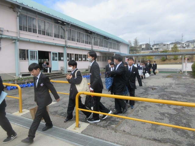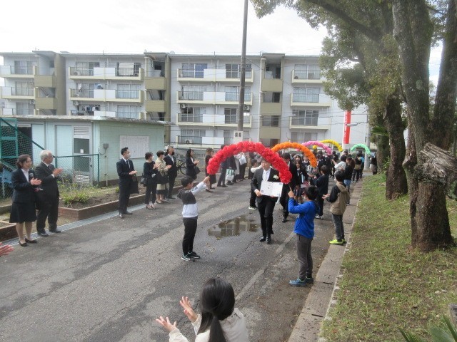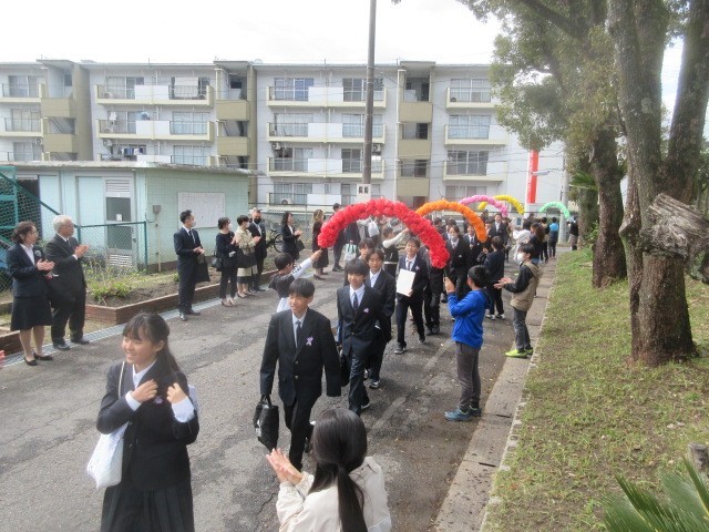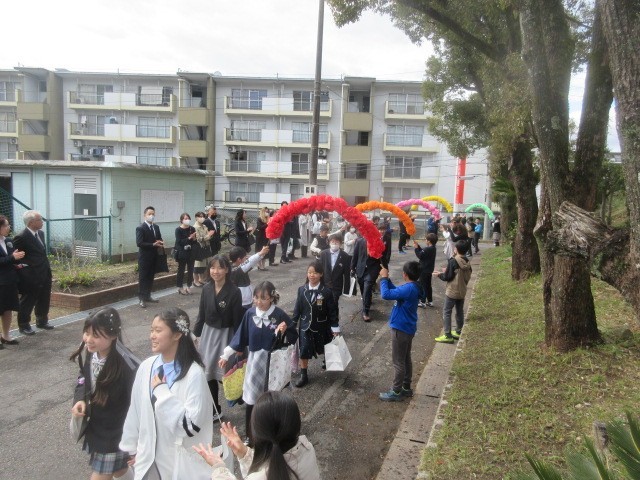 5年生による花のアーチと保護者の方や先生方による温かい拍手の中、卒業生を見送りました。これからは少し離れた場所からですが、みなさんの健康と幸せを願っています。
