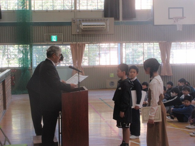 修了式に先立ち表彰と作文発表を行いました。表彰では、俳句や読書感想文のコンクールで優秀な成績を修めた人を表彰しました。続いて、1年生と5年生の代表児童からこの1年間でがんばったことやできるようになったことを発表してもらいました。2人とも生活や学習、運動など、自分の成長をしっかりと振り返って、自信をもって発表できました。修了式では、各学年の代表児童が校長先生から修了証をしっかりと受け取ることができました。
