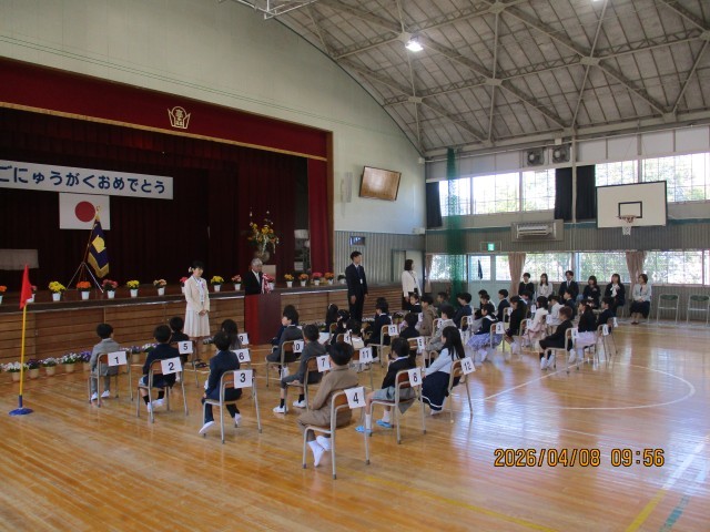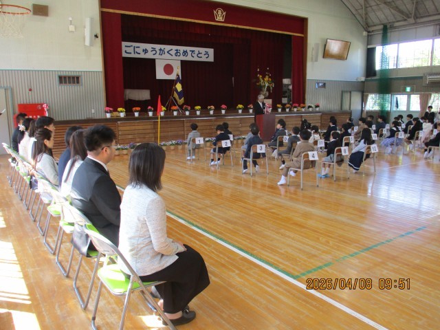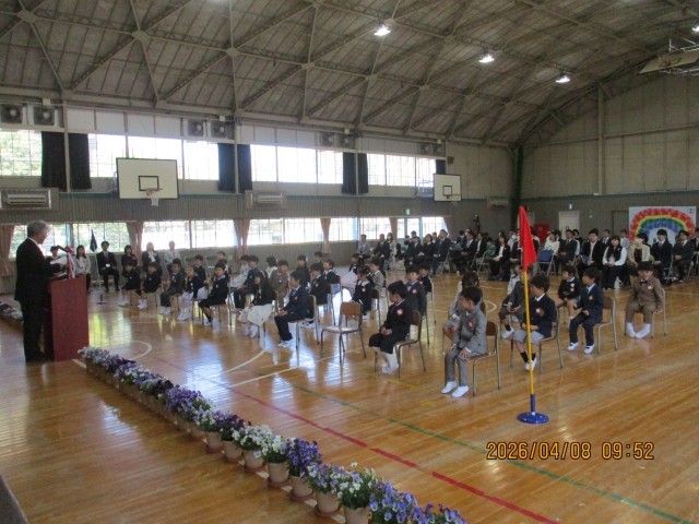今日は、新1年生の皆さんの入学を待っていたかのように気持ちのよい青空で始まりました。36名の新1年生の皆さん、入学おめでとうございます。校長先生の話の中の3つの言葉「おはようございます」「ありがとうございます」「ごめんなさい」を上手に使えるようになって、実りある小学校生活を送ってください。また、保護者の皆様、本日はお子様のご入学おめでとうございます。学校と家庭が連携していくことが、お子様の健やかな成長にとって大変有効です。心配なことや気になることは担任までご連絡ください。よろしくお願いします。