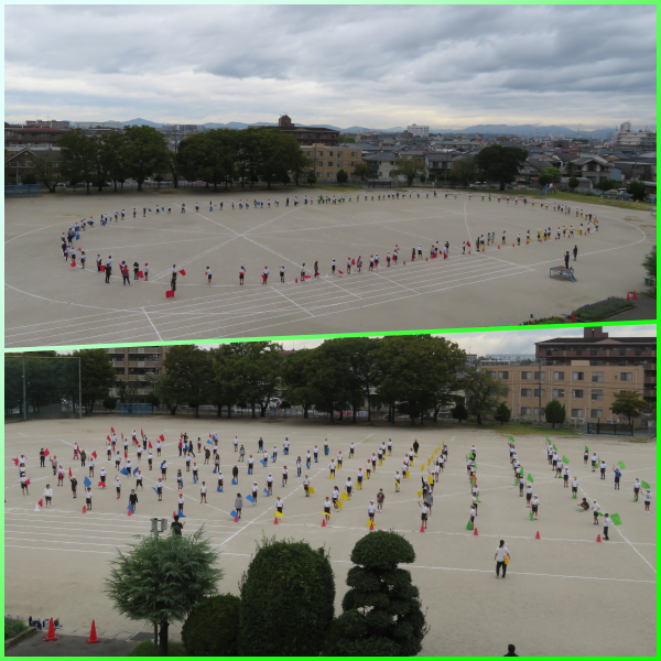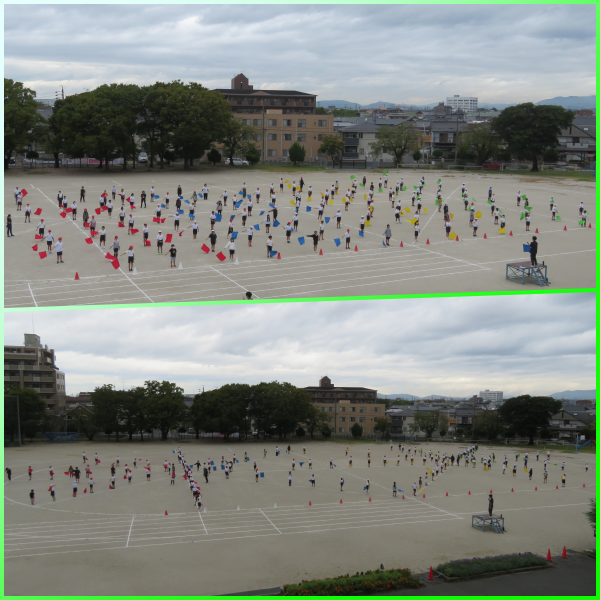 さて、今日(29日)から10月30日(木)の運動会に向けた練習が始まります。画像は今日の1限の様子ですが、全学年の口火を切って、6年生が運動場での初練習に臨みました。空には厚い雲があるなかでの練習となりましたが、今日は初回ということで、場所の確認や隊形移動について練習をしました。