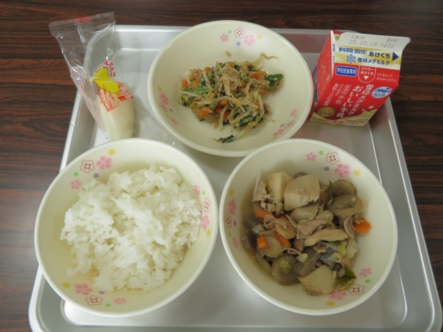 画像は今日・6日の給食ですが、昔からの風習を意識して「月見団子」が提供されました。また、おかずの「いもに」には里芋が入っていました。