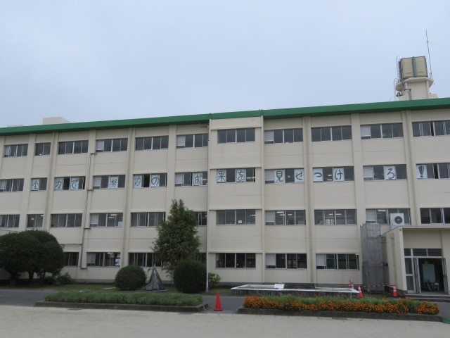 さて、運動場に面した校舎の窓に、運動会の「スローガン」が貼りだされました。児童会が考えた今回の運動会のスローガンは…