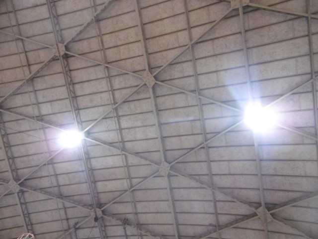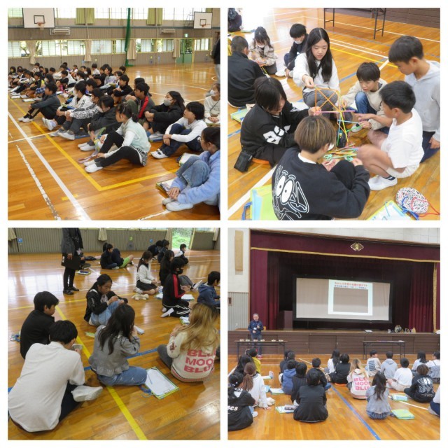 トラス構造の一番身近な例として、今回の会場となった体育館の天井があります。学校の中にも崩れないような工夫が施されていることに気づくことができました。