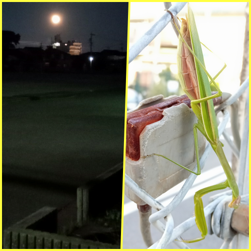 画像は昨晩(6日)の17時半頃の月の様子と、今朝(7日)の学校フェンスにいたカマキリの様子です。