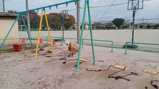 先月(10月)から本校のブランコは、部品の一部にサビなどがあって、最悪の場合ブランコが外れて乗っている人が落下する恐れがあるとの理由から「使用停止」になっていました。