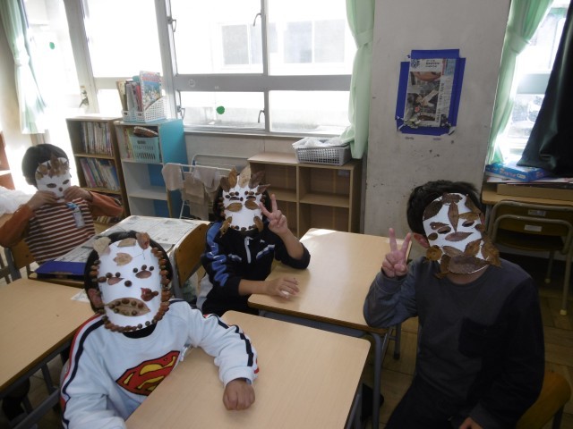 学校で、拾ってきたどんぐりや落ち葉を使ってお面づくりをしました。それぞれがテーマを決めて、楽しそうに完成したお面で遊んでいました。