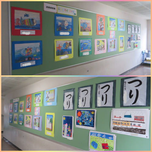 画像は本校校舎の廊下や階段の踊り場に掲示してあります、各学年の作品の数々と保健室前の掲示資料です。また、今回写真はありませんが、各教室前の廊下にも、柏原っ子たちの作品や学習のまとめ等が掲出されています。ご来校の折にご覧いただければと存じます。