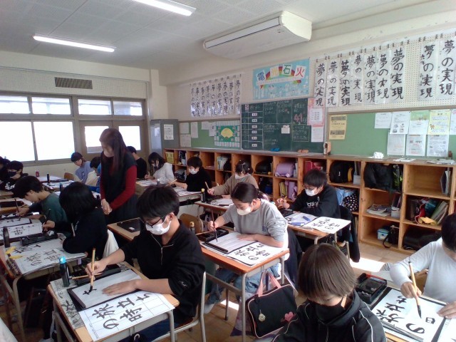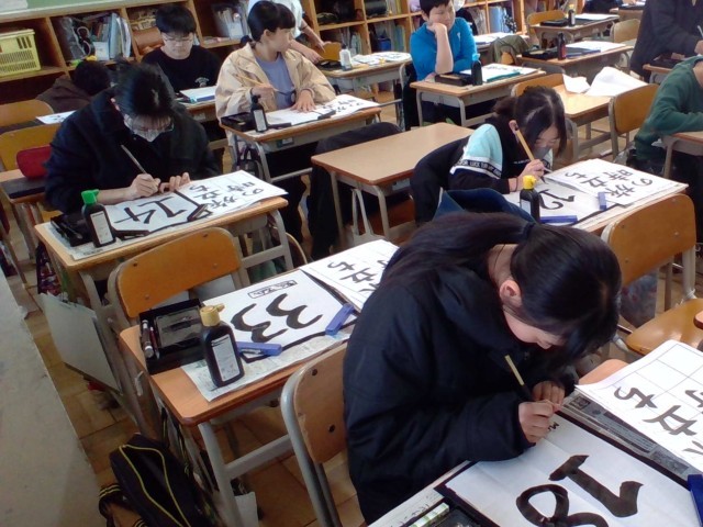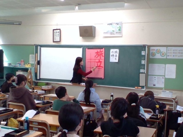 今回は、教科書の最後の課題「旅立ちの時」です。1年生から学んできた筆使いの総まとめです。初めて5文字を書くので、バランスのポイントを聞きました。そして、一つの字は小さくなっても、一画ずつ大切に腕を動かして書くことや横画の入り方など、基本的なことを忘れないように指導していただきました。