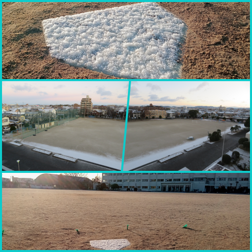春日井でも昨夜遅くから雪が舞い始め、一時は景色が真っ白になるほど吹雪く時間帯もありました。今日(22日)になって、子どもたちの登校時間に支障が出なければいいな…と思っていましたが、日の出の頃の運動場にはほとんど雪が残ってなく、ところどころ”うっすら”としていただけでした。