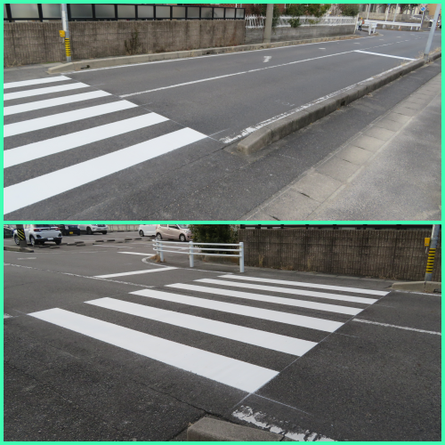今日(27日)の午前中ですが、本校北側の道路の横断歩道の補修工事が行われ、かなり消えかかっていた横断歩道でしたが、ゼブラ柄がくっきりと浮かび上がり、きれいな状態になりました。また、自動車の停止線も改めて描きなおしていただきました。