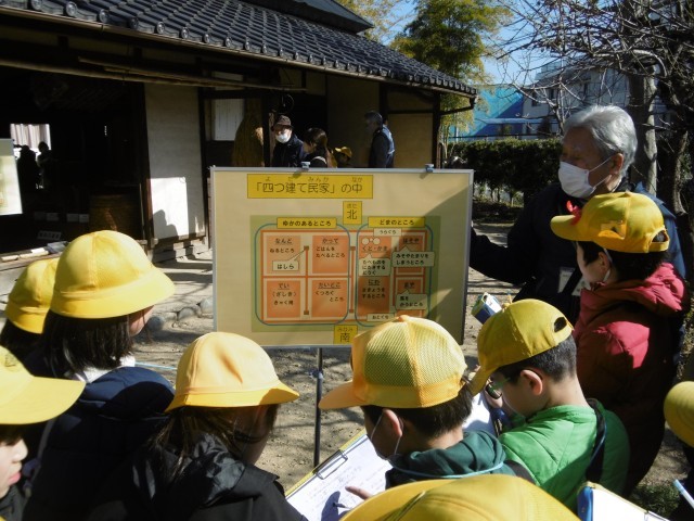 時代が「江戸」から「明治」に変わる頃に建てられた「四つ建て民家」を実際に見学し、当時の家のつくりや暮らしについて説明を聞きました。