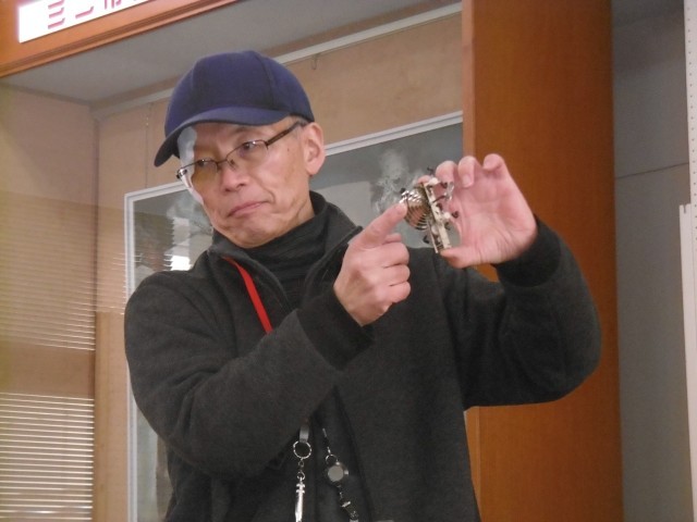 また、昔の道具が展示されている「民俗展示室」では、昔の米作りの様子などについて話をボランティアの方々から聞き、大正時代や昭和時代に生活の中で使われていた道具を実際に見たり、触れたりしながら学びました。
