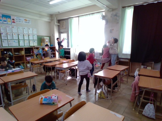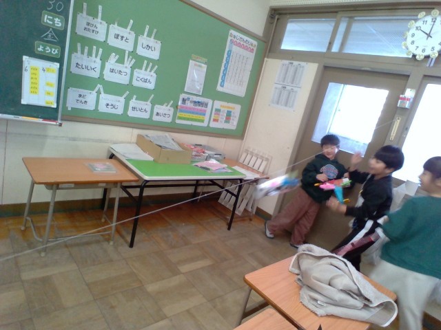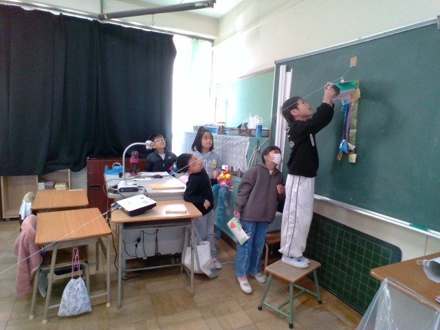 完成させた作品を糸にのせると、勢いよく滑り出します。教室のあちこちで歓声があがりました。