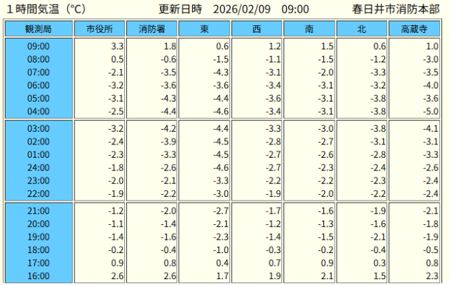 今朝(9日)は大変寒い朝になりました。先週末の休みの間もかなり冷え込んでいましたが、今朝は放射冷却も重なって、今冬で一番の冷え込みとなりました。名古屋ではマイナス3.6度まで気温が下がりましたが、春日井でもほぼ同様の数値となり、市東部ではマイナス5度近くまで気温が下がりました。